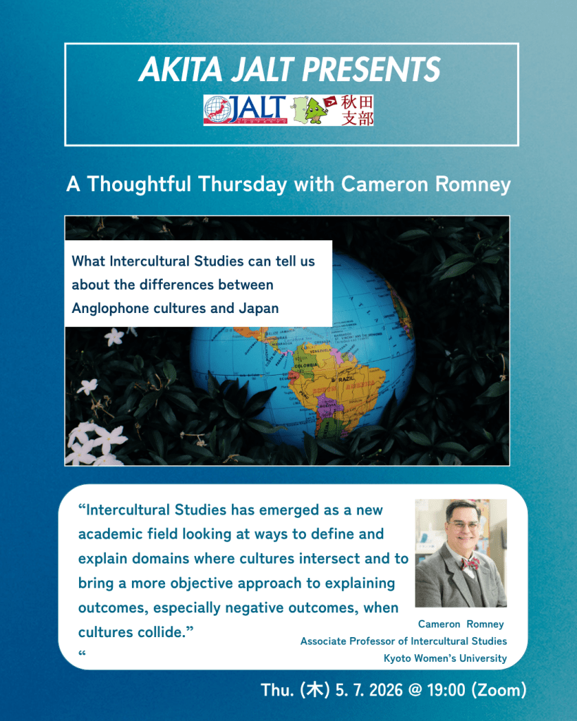 Intercultural Studies has emerged as a field that explores how cultures interact and how we can better understand outcomes, especially when misunderstandings occur. In this session, Cameron Romney will address three key questions: What is culture? What are cross-cultural dimensions? and What can these dimensions tell us about differences between English-speaking cultures and Japanese culture? The session will include concrete examples and conclude with suggestions for further reading.